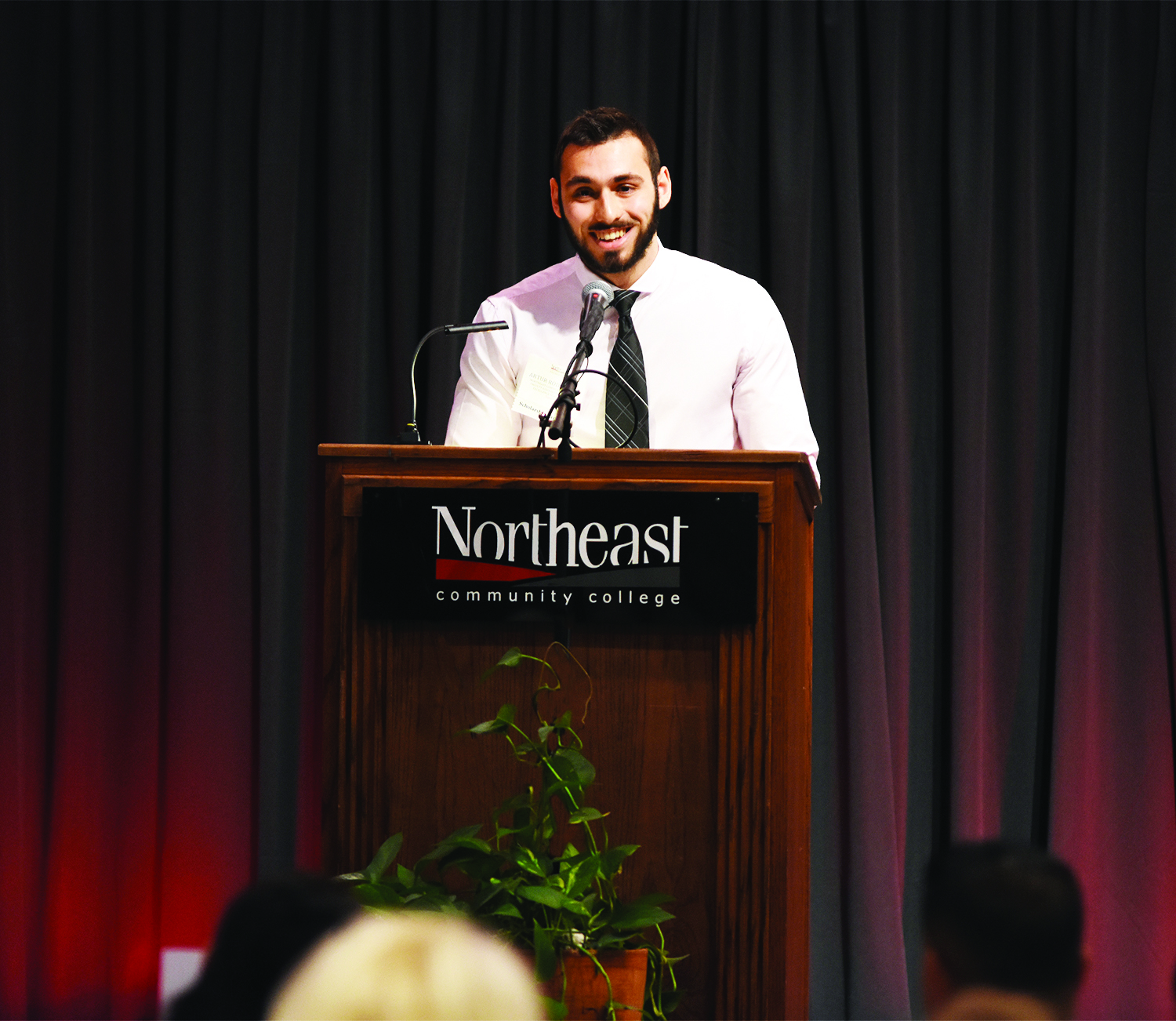 El estudiante Artur Rodrigues, de Sao Paulo, Brasil, habla durante el Almuerzo de Becas 2017 en el Northeast Community College recientemente. El evento anual se lleva a cabo para reconocer a los beneficiarios de becas y sus patrocinadores. (Cortesía del Northeast Community College)