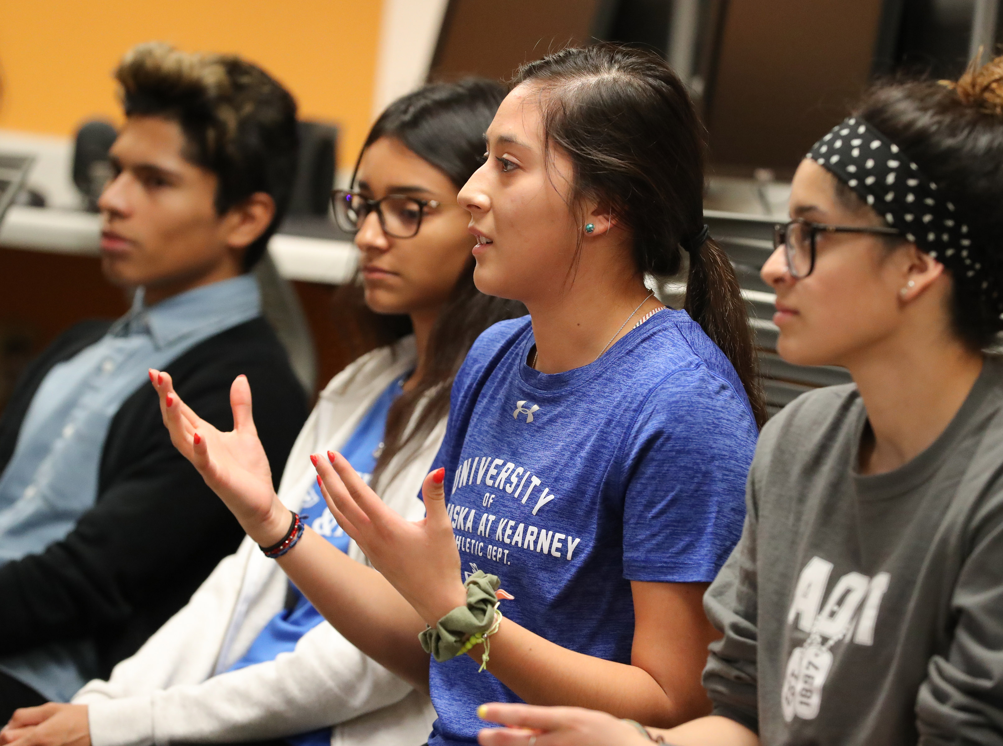 Estudiante de UNK Nadia Piñon, en su primer año y originalmente de Shelton, habla de su experiencia universitaria durante Conozca UNK, un nuevo programa para familias hispanohablantes. Alumnos de la secundaria y sus padres pueden asistir a Conozca UNK para aprender más sobre los programas académicos, los servicios para estudiantes, la ayuda financiera, y otros aspectos de la vida universitaria. (Foto de Corbey R. Dorsey, Comunicaciones de UNK)