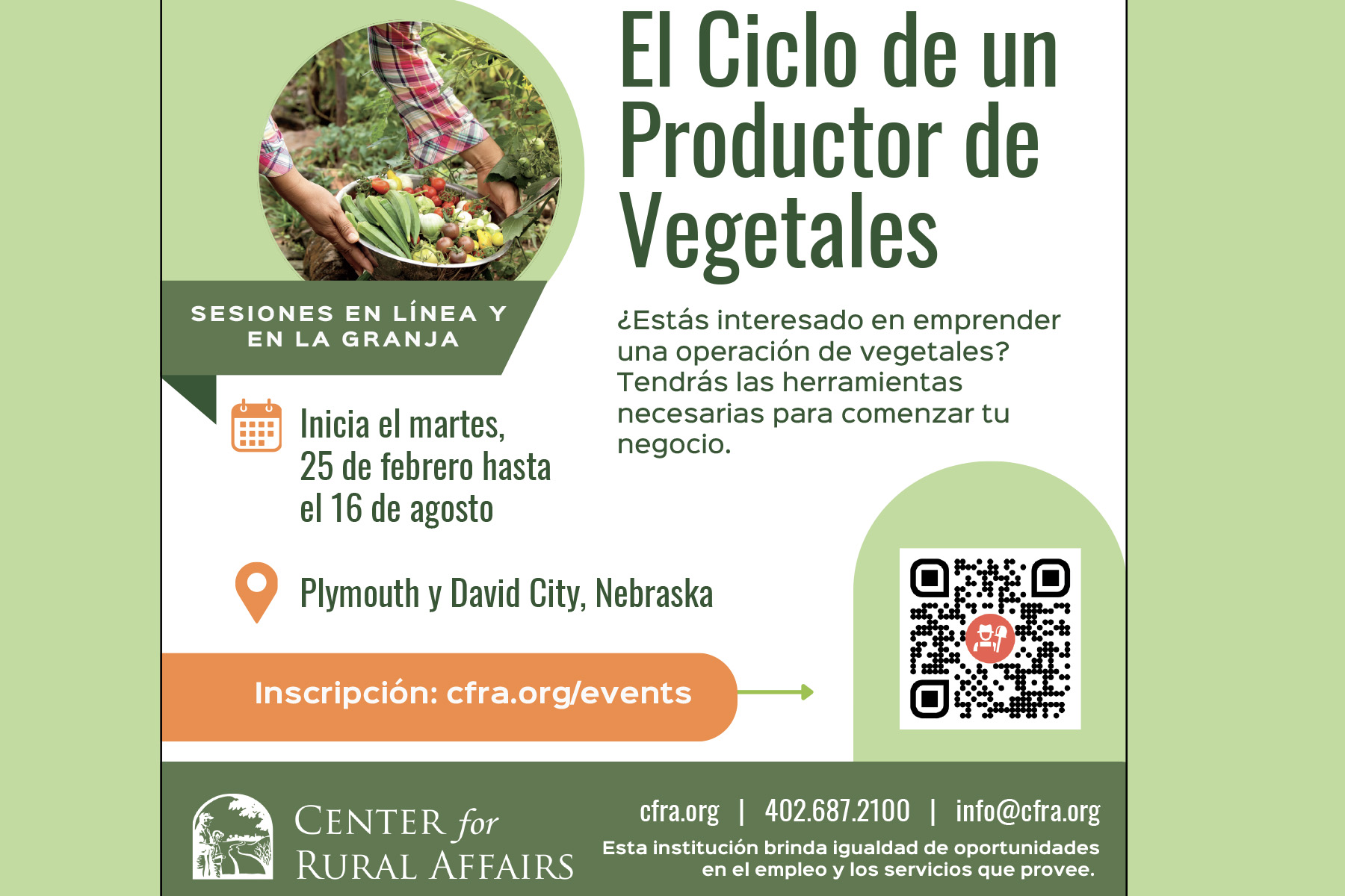 PLYMOUTH Y DAVID CITY, NEBRASKA—Los agricultores interesados en iniciar una operación de producción de hortalizas están invitados a asistir a una serie de talleres que explorarán cómo construir una granja desde cero. Estas sesiones gratuitas, en línea y en persona, se presentarán en inglés y español y serán organizadas por el Center for Rural Affairs.