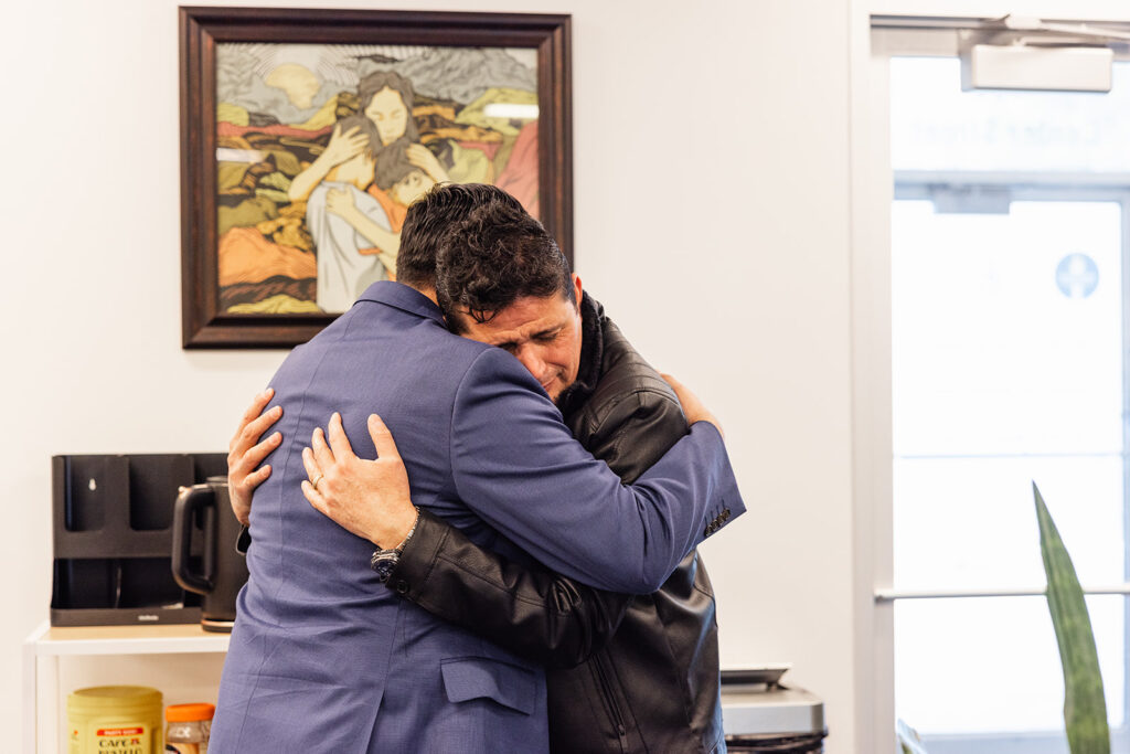 Calderón abraza a Ariel Magaña Linares, abogada principal de la CIRA, durante una reunión celebrada el viernes 13 de marzo de 2026 en la oficina de la CIRA en Omaha. (Foto de M. Julie Photo)